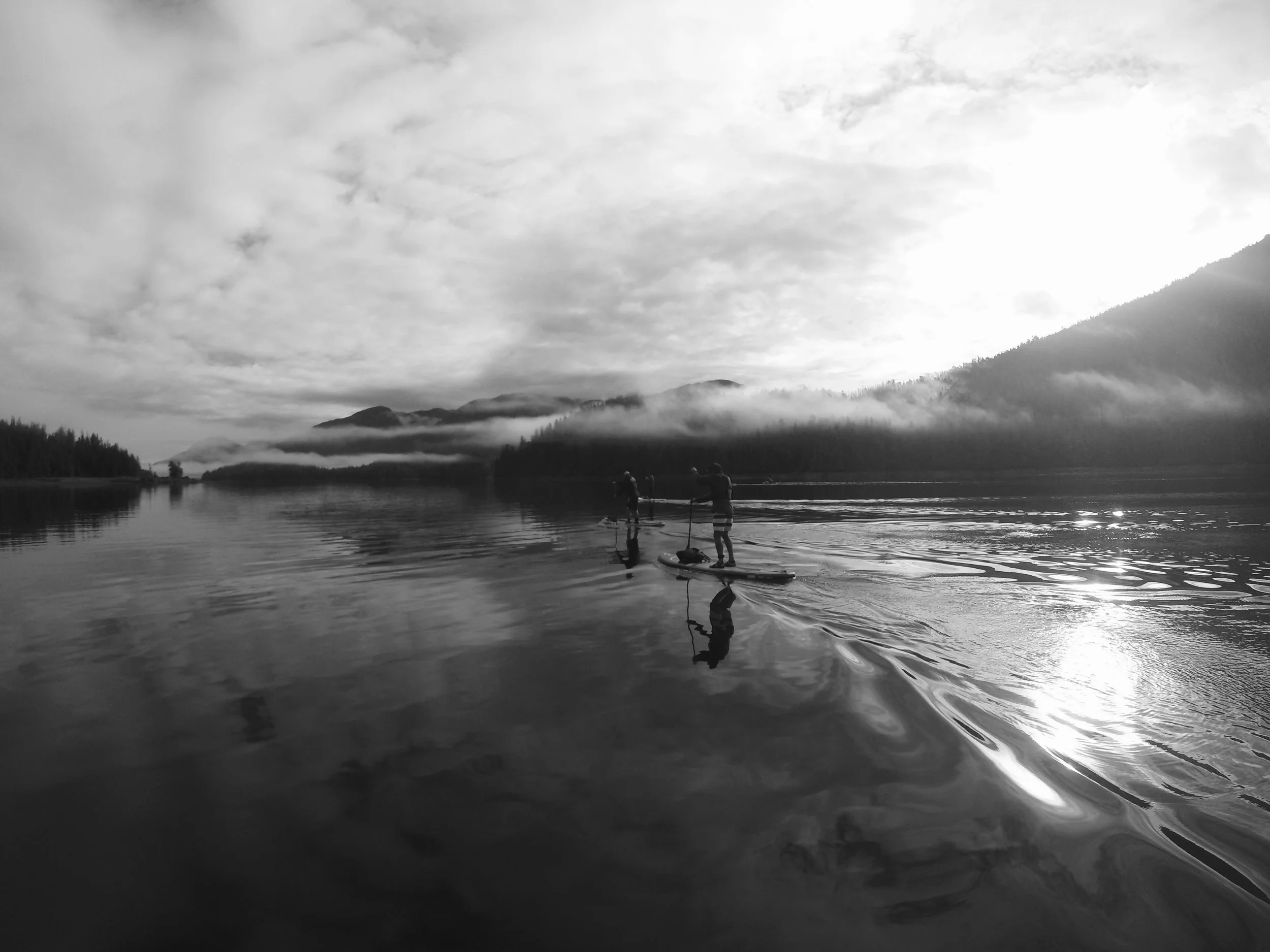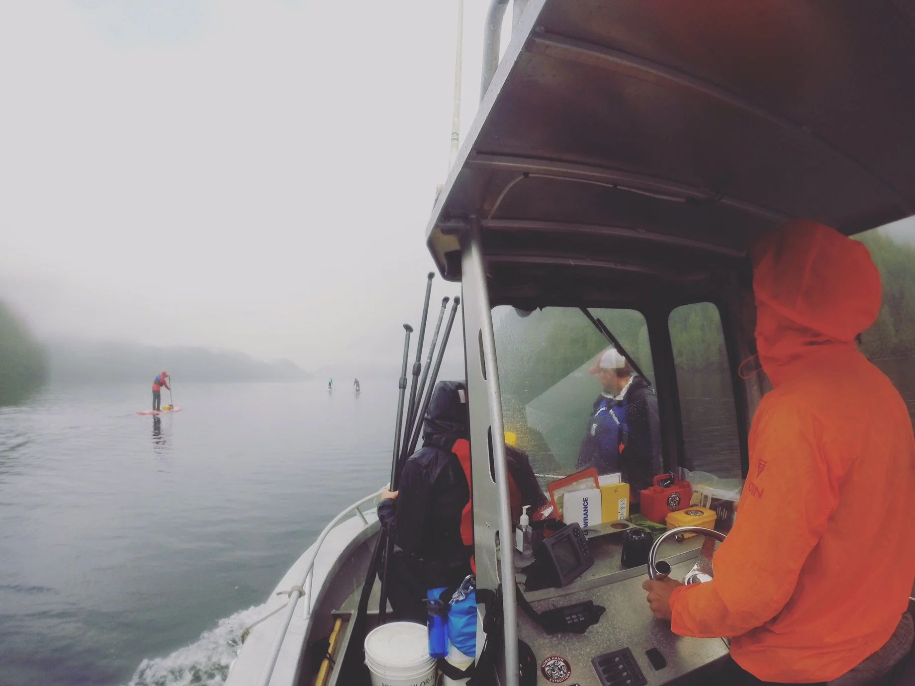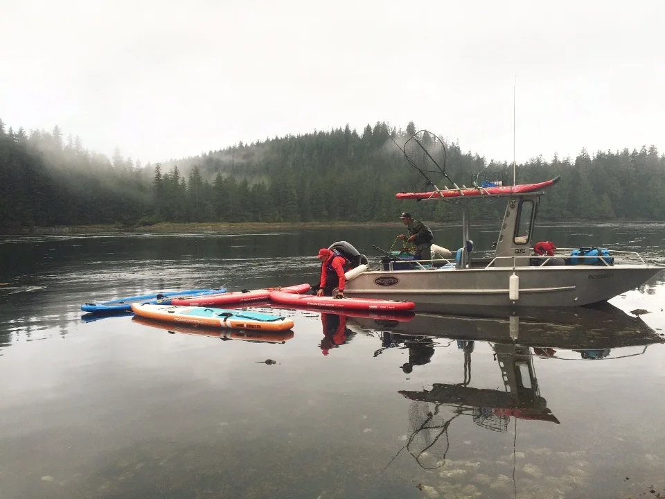 It was late afternoon when we hopped on a fishing boat to travel from Hartley Bay to Cornwall Inlet about 45 minutes away. Clement Rapid sits where the fresh water inlet meets the salt water of Whale Channel. As the tide changes so does the direction of the rapid. Timing is everything as you wait for your opportunity to pass through the gateway leading you back to the land, back to simplicity, back to beauty. It was a moody boat ride in through Cornwall Inlet with mist and fog layers painting the mountains as the daylight dwindled. We were tired from travel and wet from the rain and couldn’t begin to imagine what the week ahead would have in store for us. As the dark took over and we neared the end of the inlet a headlight was cast upon the water and ripples of light reflected upon the shoreline cascading and trickling down like a waterfall, illuminating a cedar backdrop – WAABS WII DIIS; the Gitga’at Raven Clan Longhouse. With inflatable paddleboards in tow off of the back of our shuttle boat we dropped down onto our Boardworks SHUBUs resting on the darkness of the water below. Moon jellyfish welcomed us as we ferried our gear in and landed upon the shore where we would rest our head for the next two nights. As sleeping bags were spread around the dropped firepit of the longhouse and eyes began to close the deep silence of this wild space and the spirits still dancing inside from sacred ceremonies past held us tightly. We were home.